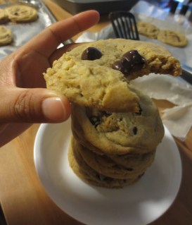 OMG. These cookies are like amazing. I couldn’t believe it when I ate one this morning when I got up and baked these at 6am before I headed to work. The very very slight crispy when you bite into it, and the soft chewy cookie bursting with caramel nut flavor…sigh…anyway, I really do think its the brown butter that makes this cookie sooo good. I’ve never had a more fragrant cookie. When I was making the brown butter, which is basically boiling butter in a saucepan until it turns sort of brownish and brown sediment sinks to the bottom, my whole apartment smelled like melted butter on popcorn at the movie theatres –> to caramel popcorn –> to that rich nutty syrupy smell. It is beyond amazing. Now I really might have a brown butter obsession because of this…until I make the next thing, I’m going to be dreaming about this cookie. Yes, its that good…