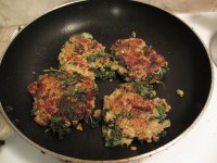 I loveee kale and I loveee quinoa! Two things smacked together- perfection! I was first introduced to quinoa by my dear friend and cookie monster and have been learning about the grain ever since. It is high in protein, gluten-free, from the Andean culture, and has gained so much traction these past few years. Some people don’t really like the quinoa smell/taste, but if you soak it for about 5-10 min before you cook it, the ‘bitter’ smell/taste will go away. Or you can cook it with things that hide the taste! I happen to like the weird taste and texture. It is a great substitute for rice, if you ever get bored or tired of it. Kale is another vegetable that has grained traction these past few years and I, like any other human rabbit out there, love it. I love the hard texture and the strange bitter taste. Both of these food items have become staple in my everyday diet. I am just glad to be a human rabbit who enjoys veggies, grains, and weird healthy stuff. Anyway, enough with my rabbit talk. These kale and quinoa cakes are great for breakfast, lunch and dinner! I dip the cakes with some Trader Joe’s Garlic Aioli Mustard and it becomes that much better. I hope that I have opened some taste buds to some noob kale and quinoa people!!! β€