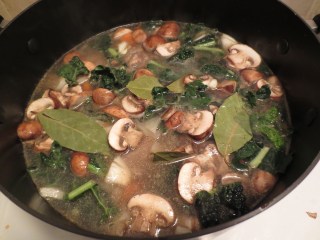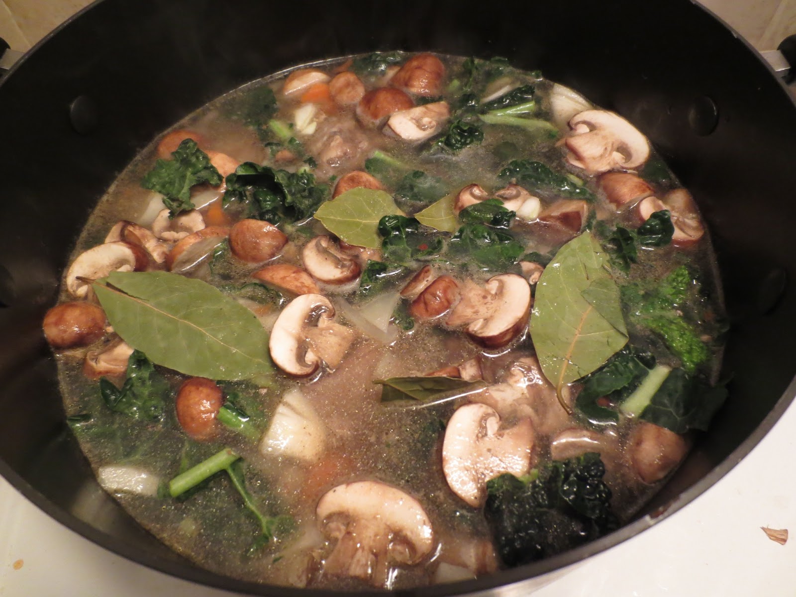 3. Add the carrots, onion, kale, mushroom, garlic, salt & pepper, bay leaves, water.