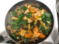 2. Brown the ground beef and onions with salt, pepper, curry spice.