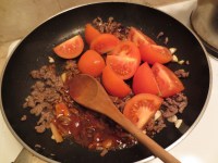 3. When beef is browned, add tomatoes, and onions if desired, along with the ketchup, soy sauce, and oyster sauce.