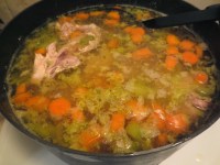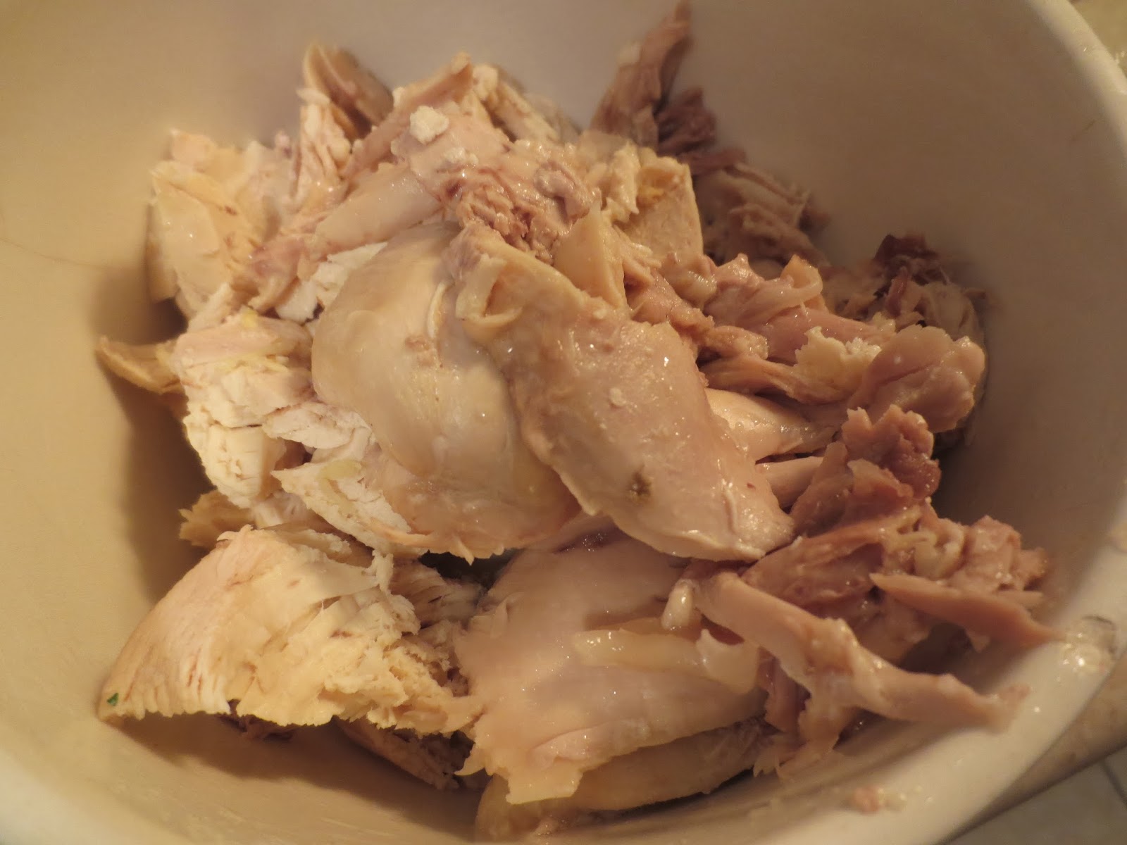2. Take out chicken and slice the meat off. Do the best you can. Throw the bones back in. Set the meat aside.