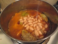 2. In a pot, combine chicken broth, pumpkin, seasonings, bay leaves, and chili.