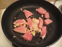 3. In a large pan, heat up some olive oil on med-high. Stir in garlic and pork. When pork is almost ready, stir in tofu.
