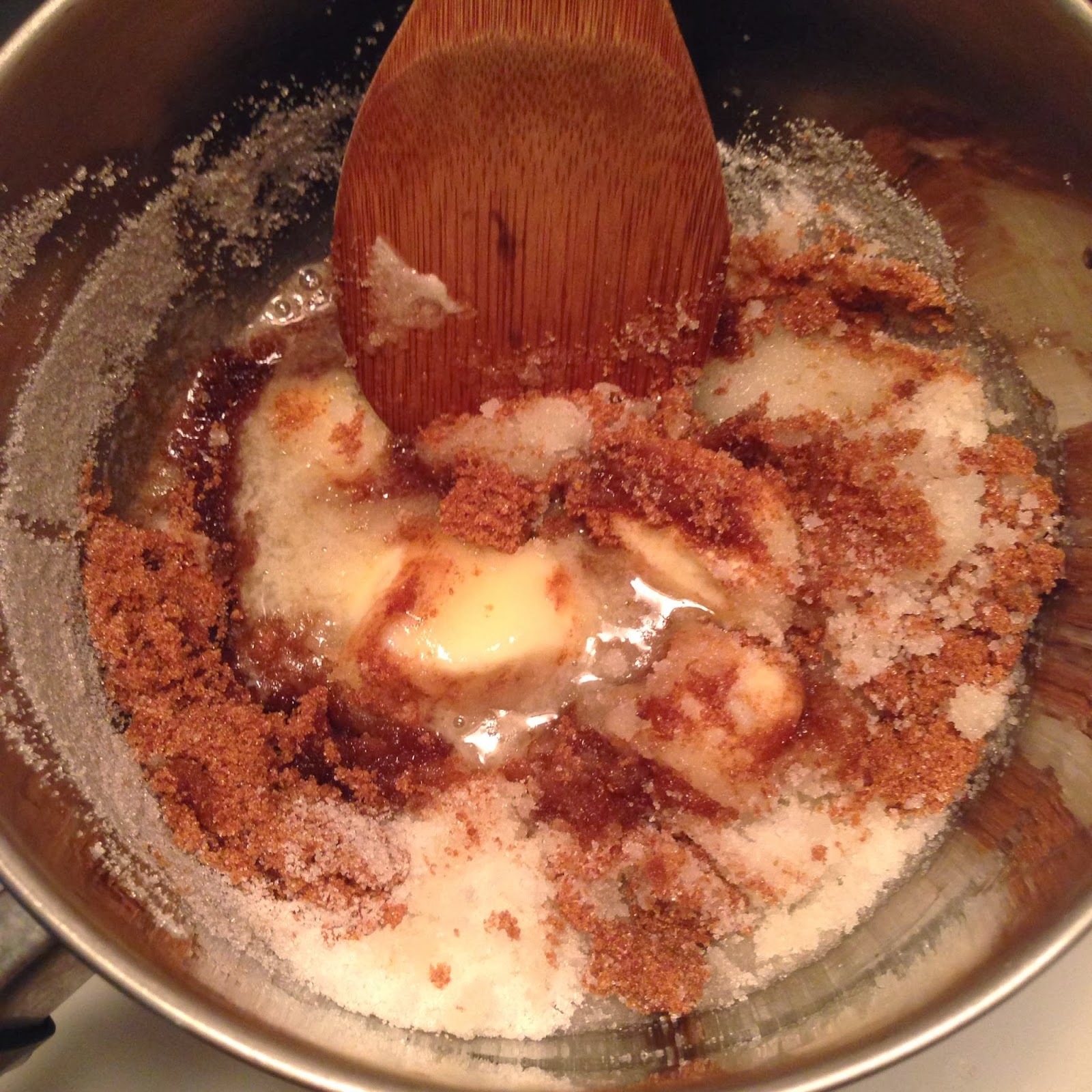 2. In a medium saucepan, melt butter. Add sugar and light brown sugar.