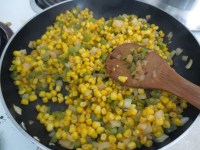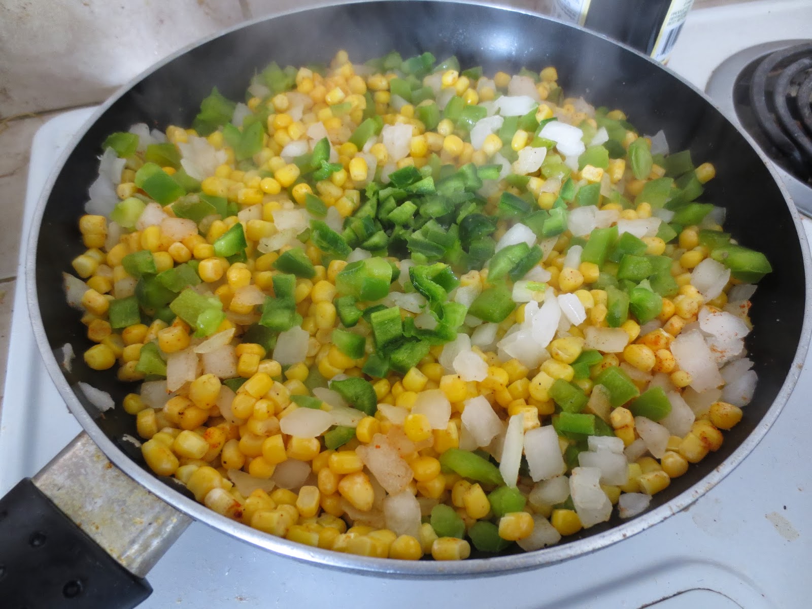 1. In a large pan, heat some olive oil or butter. Pour the corn, onions, garlic, jalapenos and green peppers into the pan.