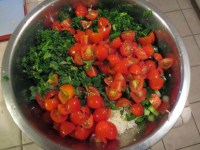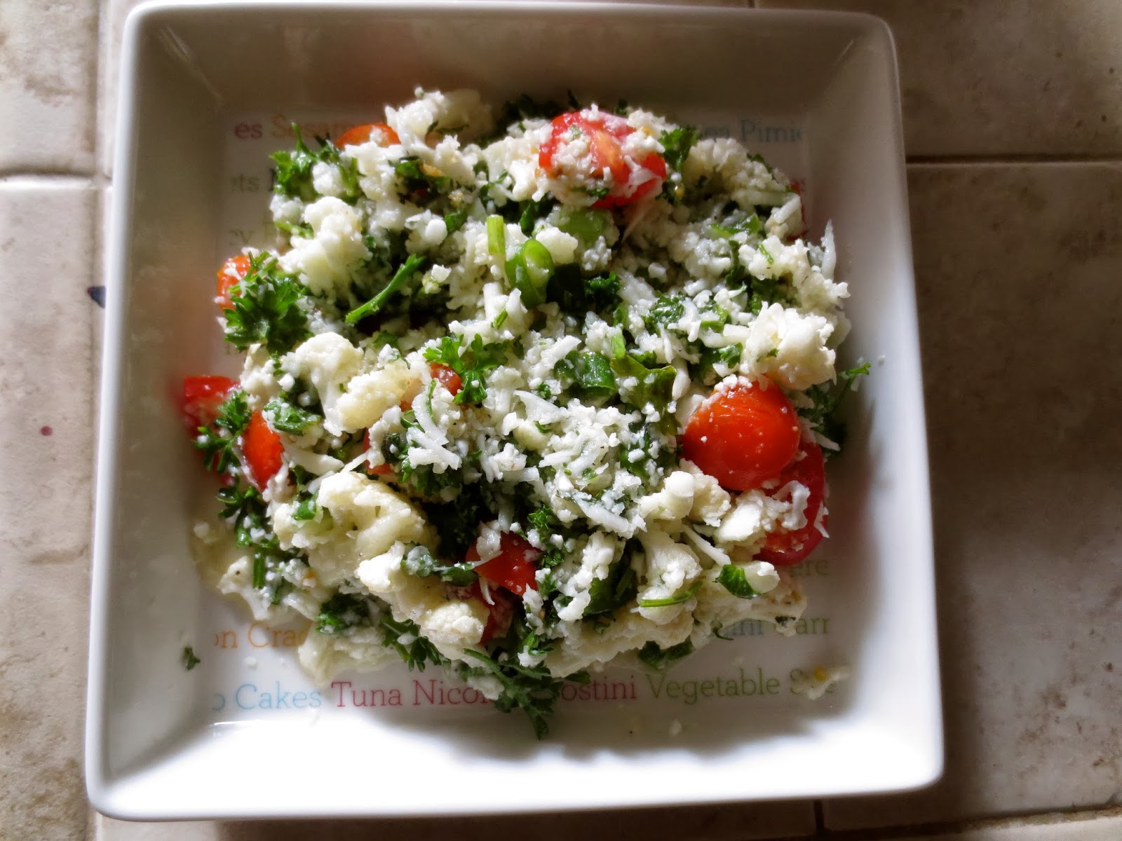 2. Mix together the tomatoes, cauliflower, parsley, mint, and cilantro in a large bowl.
