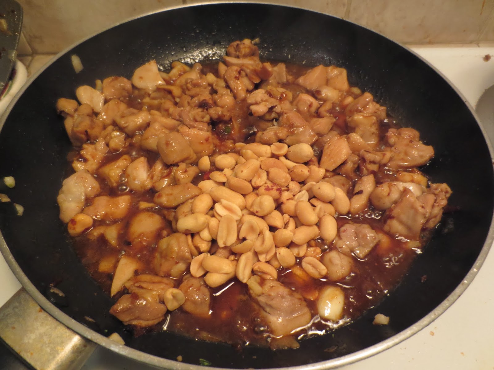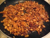 3. Pour the peanuts and the sauce onto the pan and let the chicken cook, and the sauce simmer down until there is barely any sauce left. If you can’t chop chicken into small pieces like me, you can use this time to use your spatula and cut the chicken into smaller pieces.