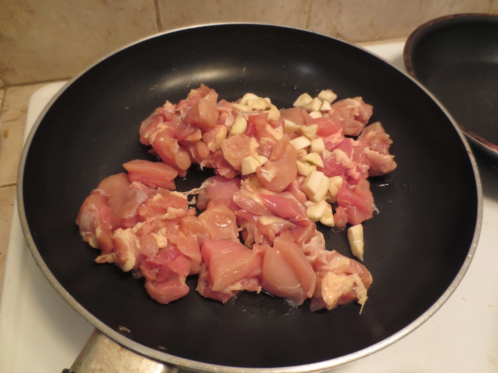 2. In a large pan, heat up some olive oil on medium-high heat. Stir fry the chicken and garlic until it turns color.