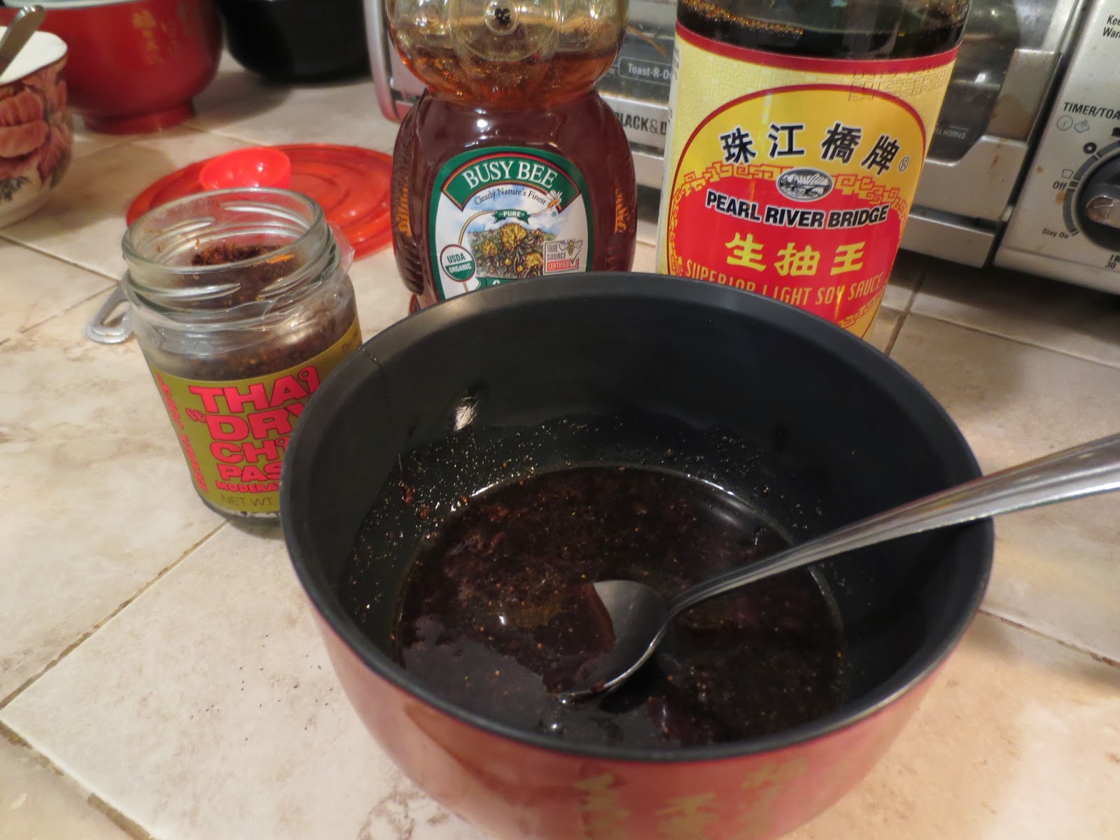 1. Mix together the soy sauce, honey, chili, rice wine, and sesame oil in a small bowl. Set aside.
