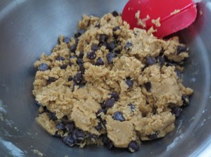 5. Using a spatula, mix the flour into the batter. Add the chocolate chips.