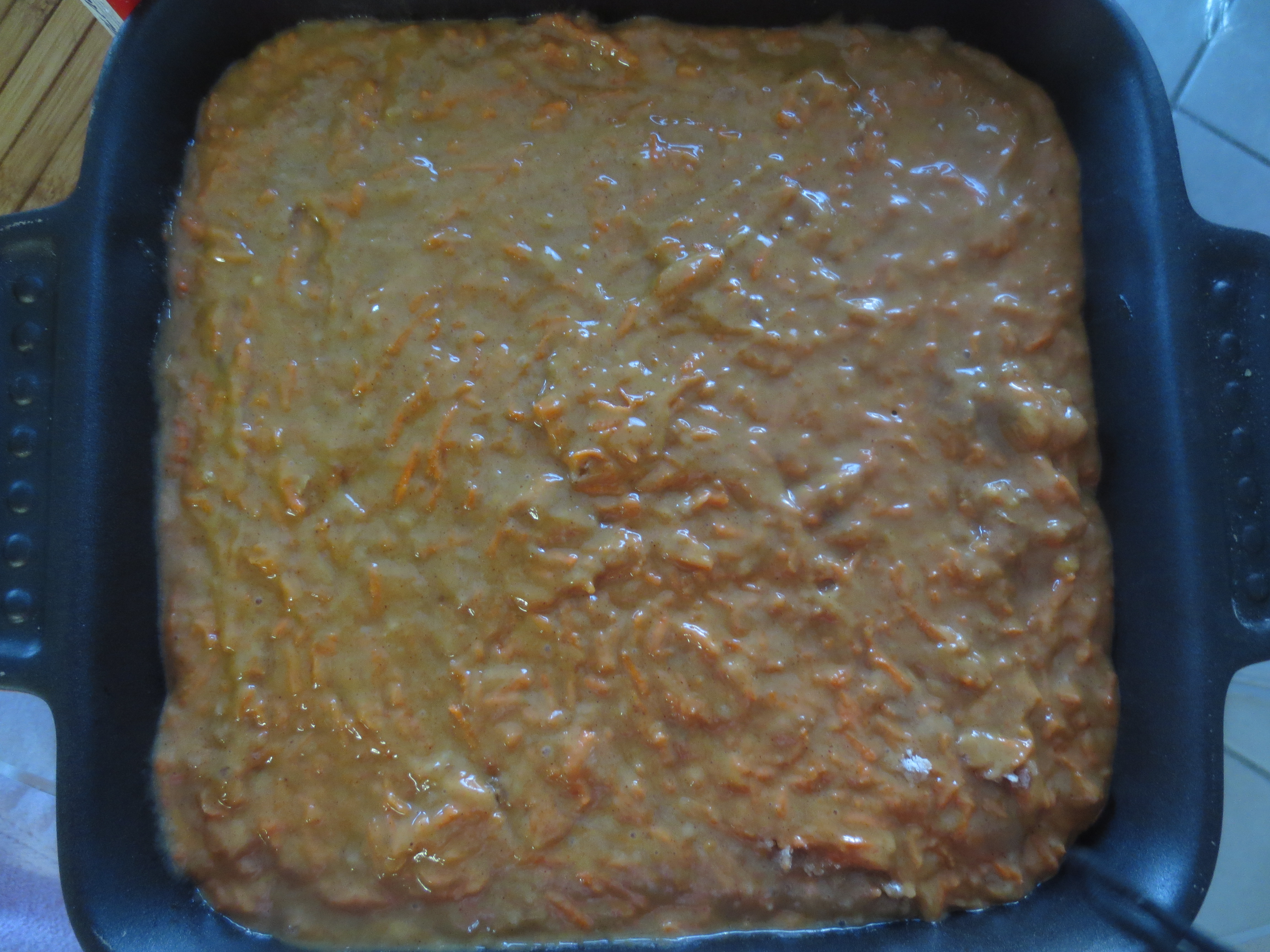 8. Spray/oil a round or square 8-9 inch baking pan. Pour batter into pan.