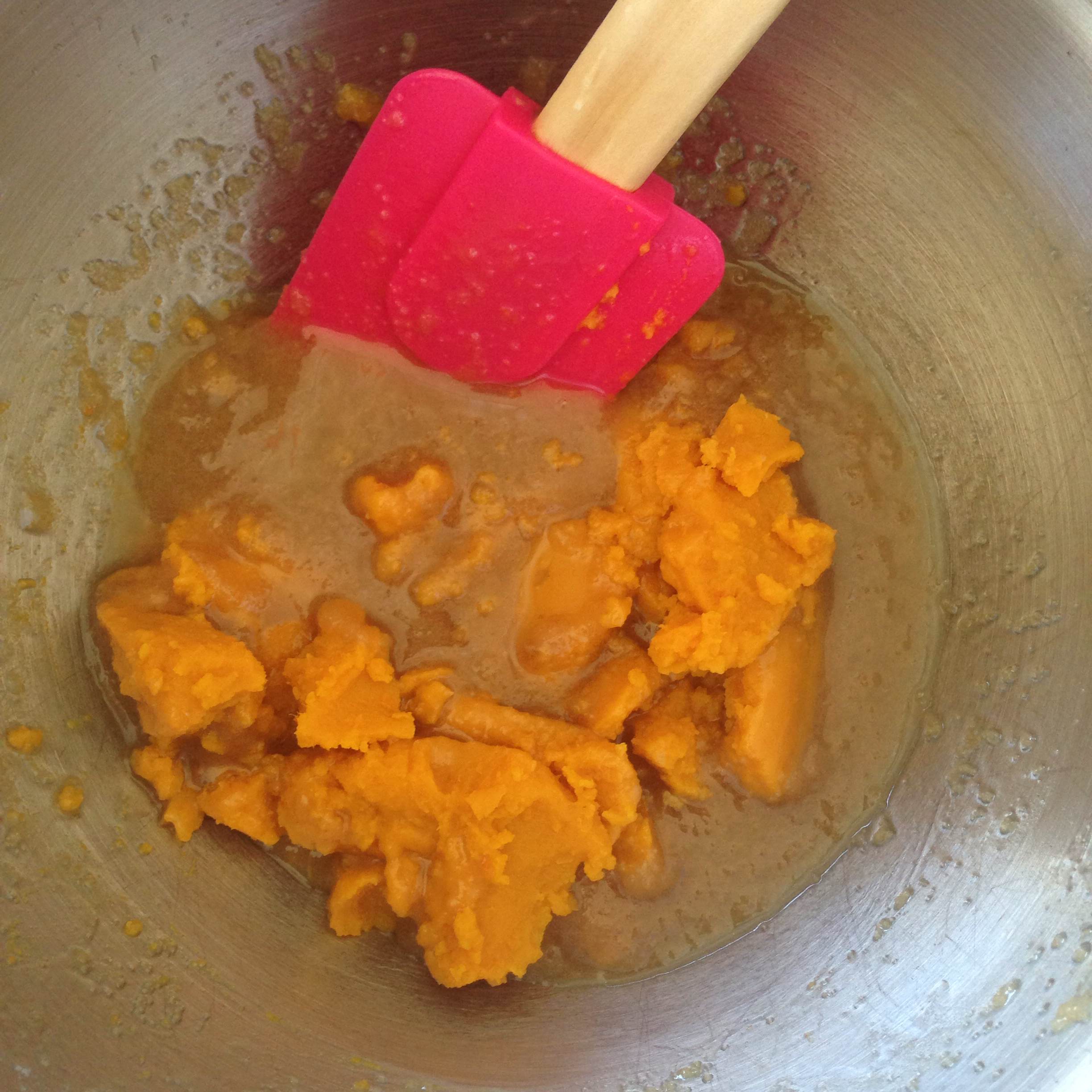 1. In a large bowl, mix the butter, brown sugar, granulated sugar, and pumpkin until combined. Add the vanilla and mix.