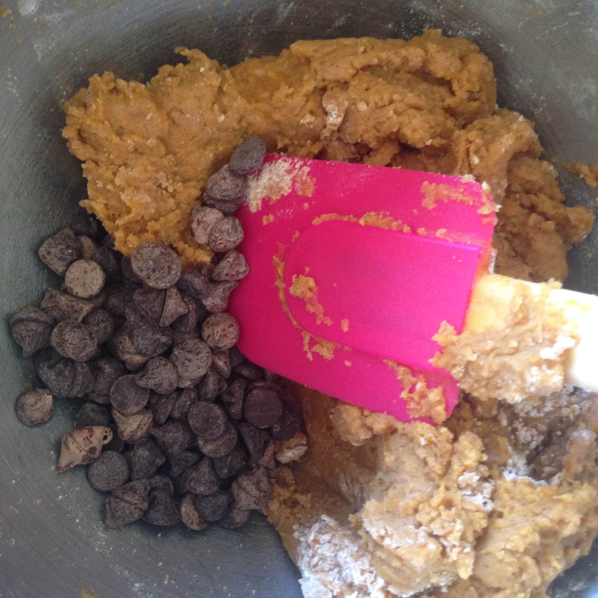 3. Mix the wet ingredients into the dry ingredients by hand using a spatula. Mix in the chocolate chips. The dough will be very soft!