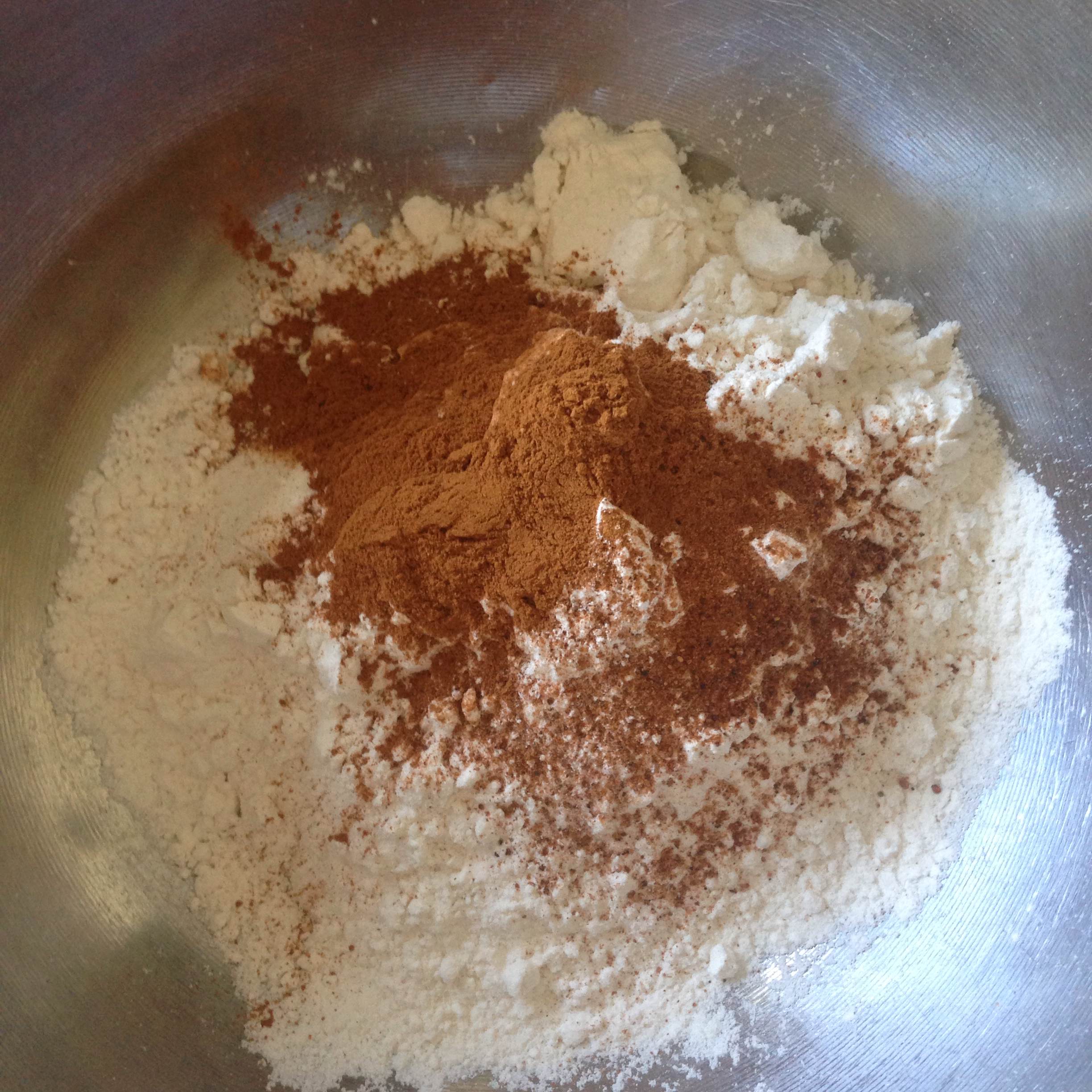2. Preheat oven to 350 deg. Mix together flour, baking soda, baking powder, and cinnamon. Set aside.