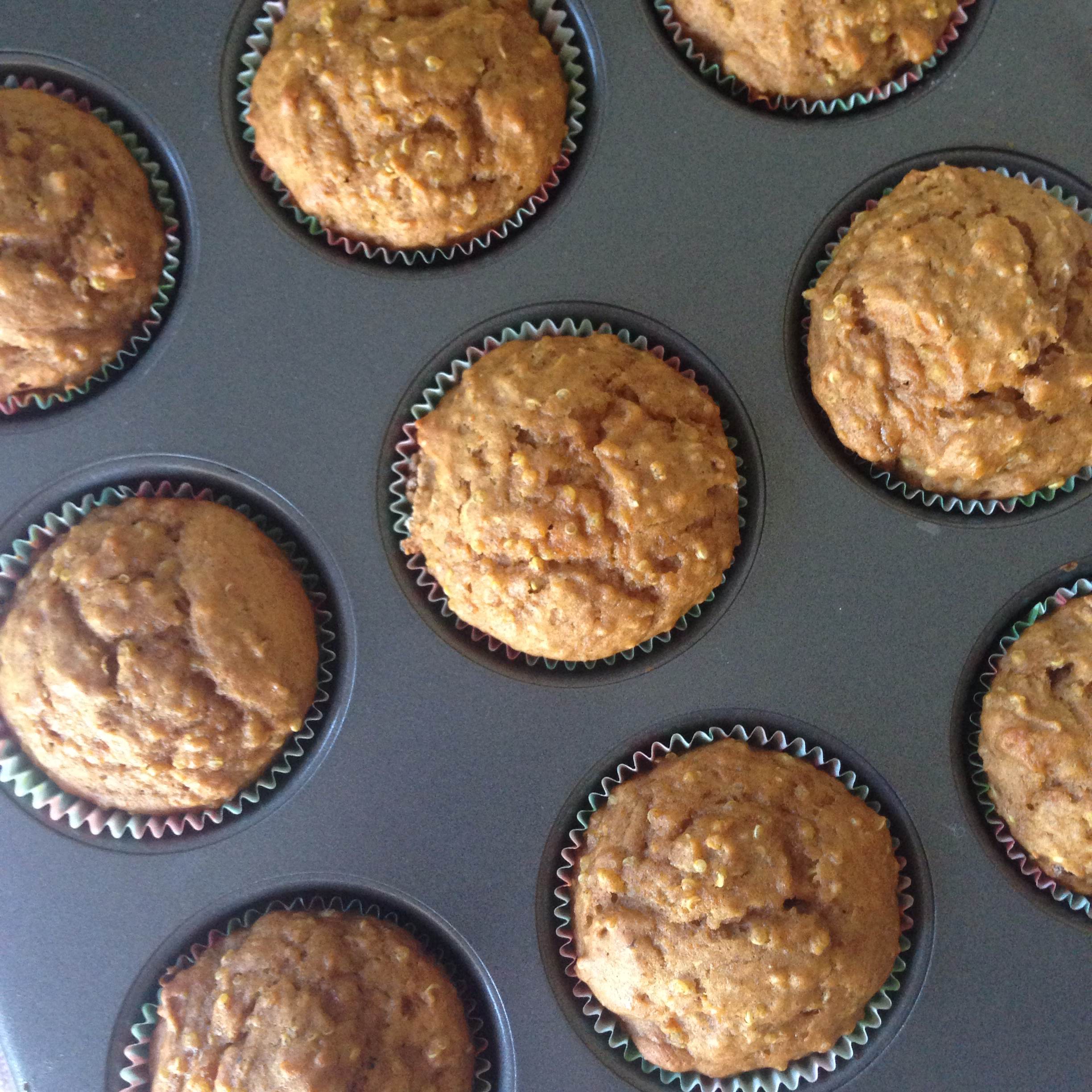 More pumpkin pumpkin pumpkin!!! I made these in an effort to conserve energy in the morning and grabbing and going with my breakfast as a leave the house to board a bus. I learned awhile back that you can freeze muffins and then when you want to eat them, place them in the fridge overnight and it should defrost. Pop them in the microwave and you have got a hot muffin! How fun and convenient!! It’s like when I learned you can do that with bagels – one of my obsessions. More on that obsession some day. These muffins are packed with nutrition – pumpkin, quinoa, spices. It is an easy way to pack quinoa into your routine if you don’t want to cook it all the time. Quinoa is very high in protein so you can eat it to fuel your day! It is basically a seed, and it is fascinatingly related to spinach, beetroots, and tumbleweeds (I actually once had a friend tell me that he thought tumbleweeds were fake things that crossed in Bugs Bunny’s path in the cartoon…I basically choked in laughter.) Anyway, these are perfect fall breakfast foods! Enjoy them today!