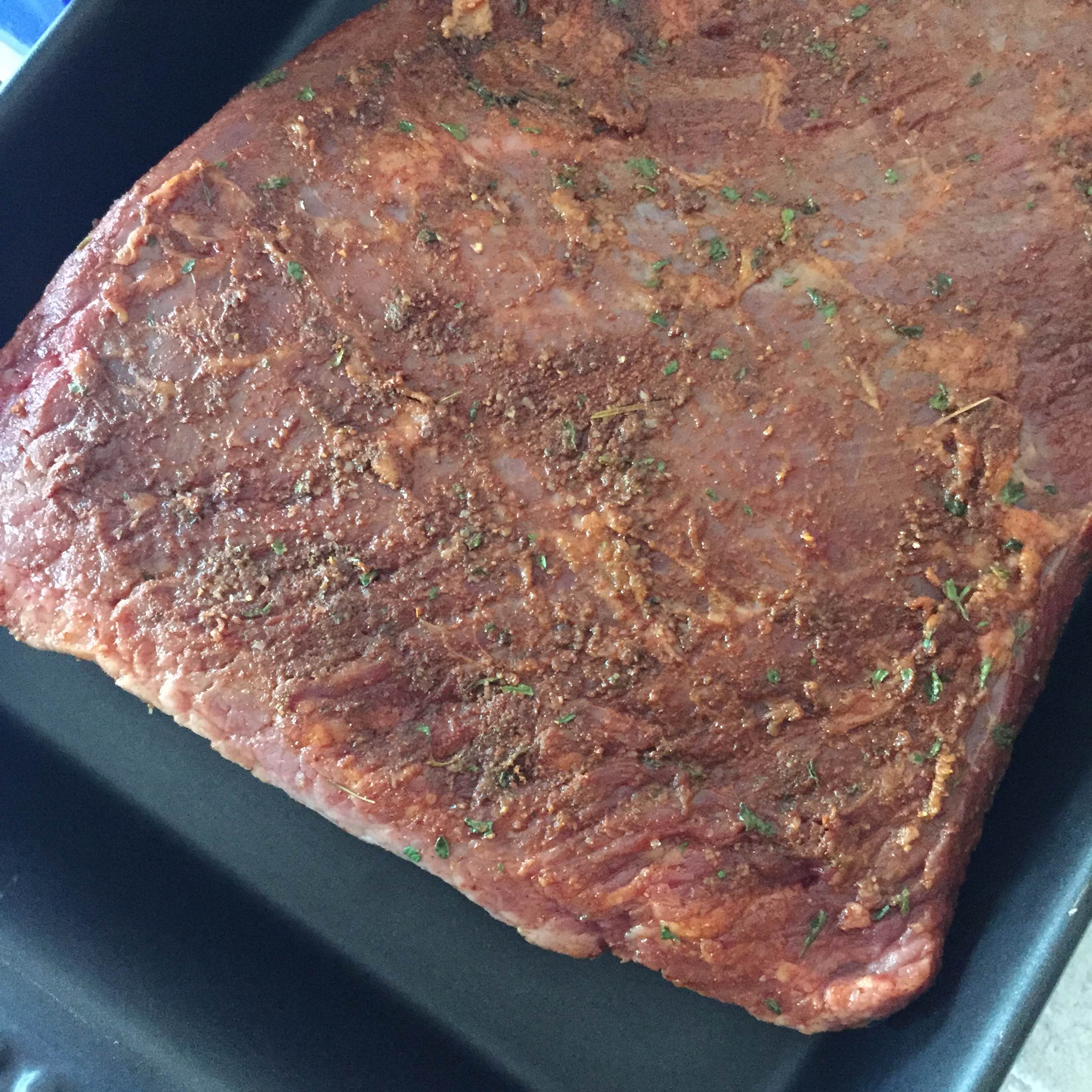 1. Dry rub the mixture of seasonings onto the brisket. Place in a 9×13 pan.