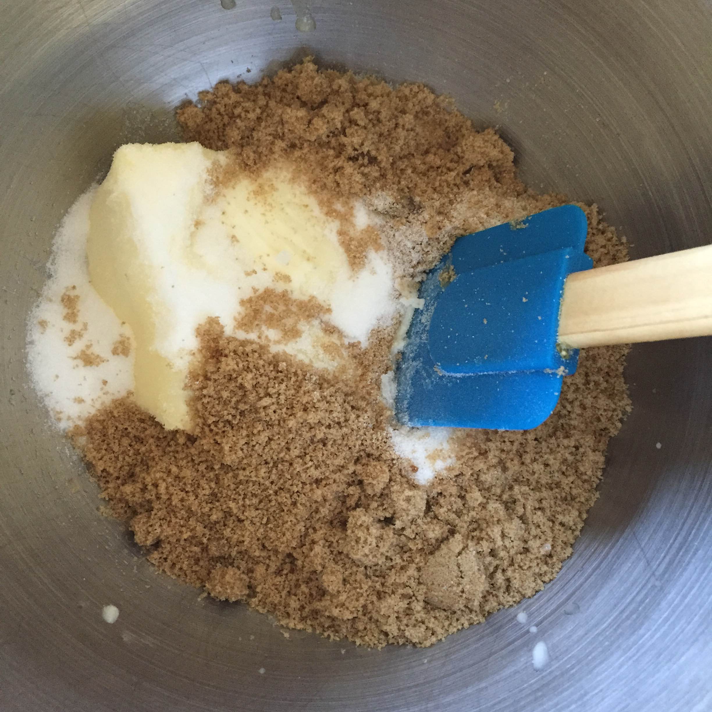 2. In another large bowl, using a spatula (no need for machine), mix by hand the softened butter, white sugar, and brown sugar until combined.