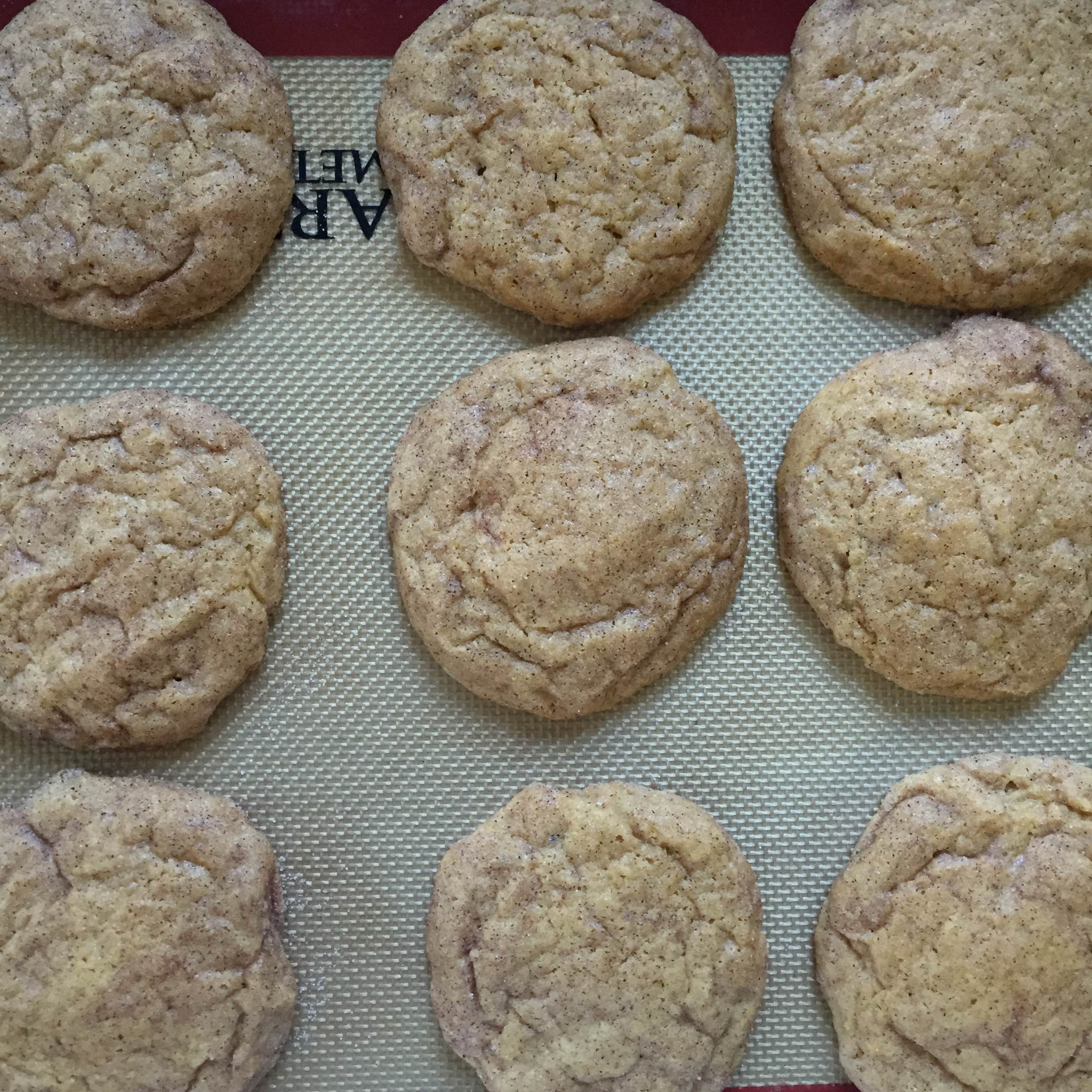 9. Bake for 10-12 minutes. If you have about 12 cookies on your sheet, my oven took about 12 minutes. Some ovens might take shorter or longer. The key to soft and chewy is to underbake them slightly, but still make sure that the edges are golden brown and the cinnamon sugar on top has formed a nice crackle crust.