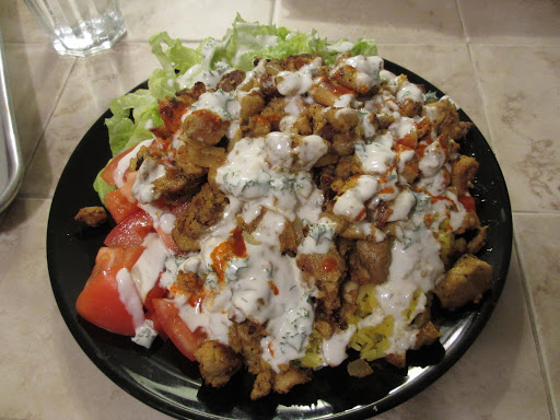 So I did my research and learned that halal food is food permitted by Islam for consumption because they have a list of things they can’t eat, such as pork, because they are slaughtered in a certain way. “Halal” means lawful. “Haram” means forbidden. Interesting right? I also learned that there are numerous halal street carts around NYC, and each have their own unique ‘white sauce’. I seriously thought there was only one cart that people go to, but I guess only tourists like my friends only know about one. haha! I tweaked the recipe a little bit- for example, using romaine lettuce instead of iceberg. Ew…*shudder*, I hate iceberg lettuce because its so cheap, flavorless, and nutrition-less. I also used A LOT less mayo for the white sauce…I HATE MAYO. I think mayo is awful. Anyway, my recipe and tweaks turned out pretty well- I enjoyed eating it because I love all the spices and freshness of the white sauce. Because I have never tried the real one, please dont hate me if this recipe doesnt turn out exactly like the halal cart ones in NYC.