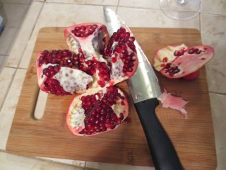 2. Then you will see some seeds show. Cut through the skin, top to bottom, in between the clusters. Using your hands, break apart the sections.