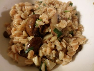 I haven’t really cooked in a week because of a midterm and have been eating salads and tons of protein everyday! Needless to say, I have been craving some sort of carb. I had some mushrooms in the fridge that I had been saving for either a mushroom pasta or risotto. I chose risotto tonight! Risotto is one of my fave dishes- rich, creamy, and definitely filling. Risotto is always so expensive at restaurants and usually because of the gourmet fancy ingredients such as truffle oil, wild mushrooms, and what not. My version is equally tasty and creamy. I thought the creaminess came from lots of cream and cheese, so it scared me away for awhile, but most of the creamy texture actually comes from starchiness of the grain itself! Risotto is typically made with Italian arborio rice, high in starch and cooking it releases this starch to create creaminess. I thought I had bought some, but when I came home, I realized I had Italian farro instead! I quickly looked up if I can remotely even make a risotto dish with it– turns out I can! Farro is a wheat grain, so I bet it is slightly healthier than arborio. It is definitely less starchy, but definitely not enough for the end dish to lose creaminess. Try it yourself with either arborio or farro!