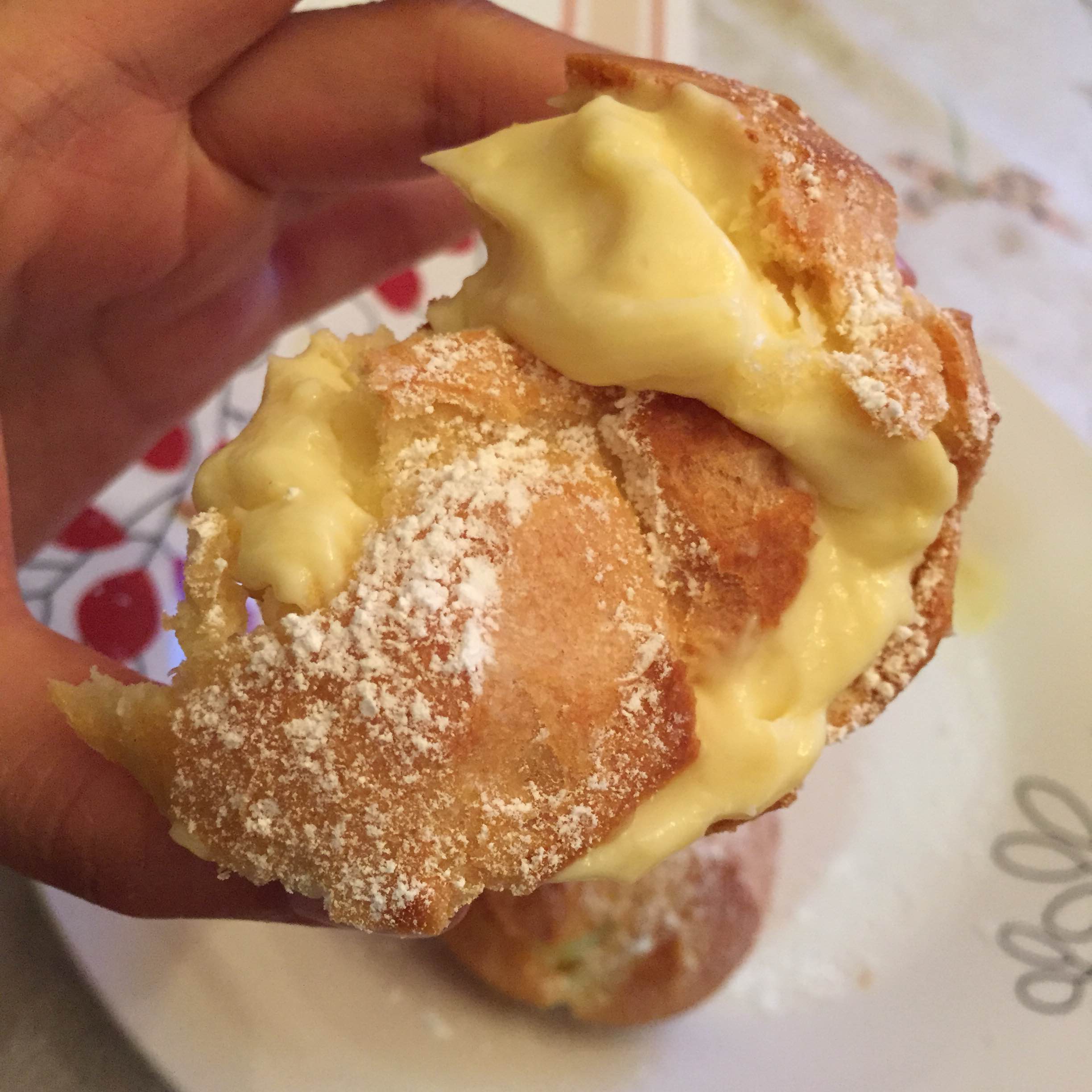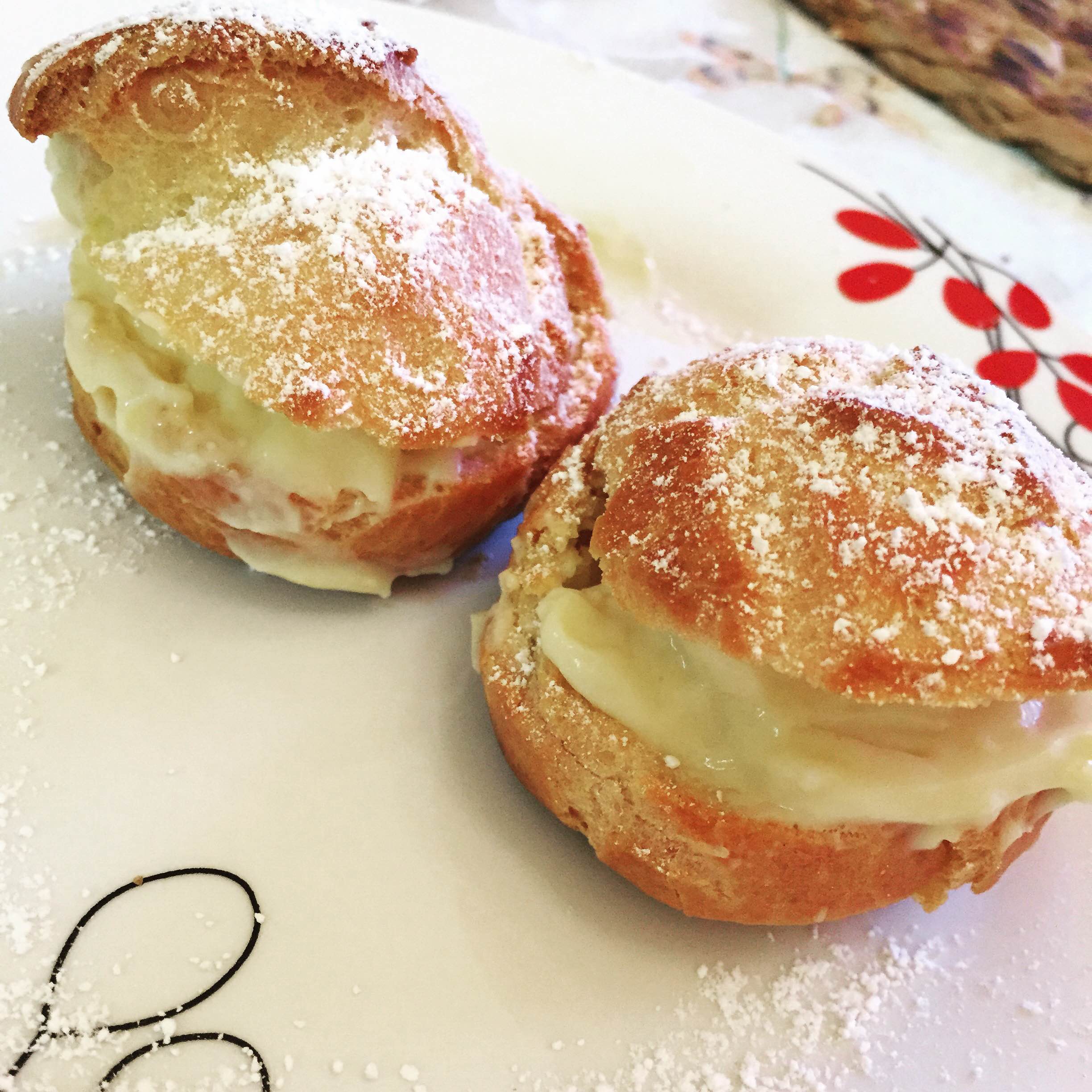 These cream puffs were made with leftover Fruit Tart pastry cream! (But I have provided the exact recipe for 12 cream puffs in case yall just wanted to make the puffs and not the tart). I made exactly 12 little ones (if you want, you could make 6 Beard Papa’s sized ones if you wanted with the same amount of cream.